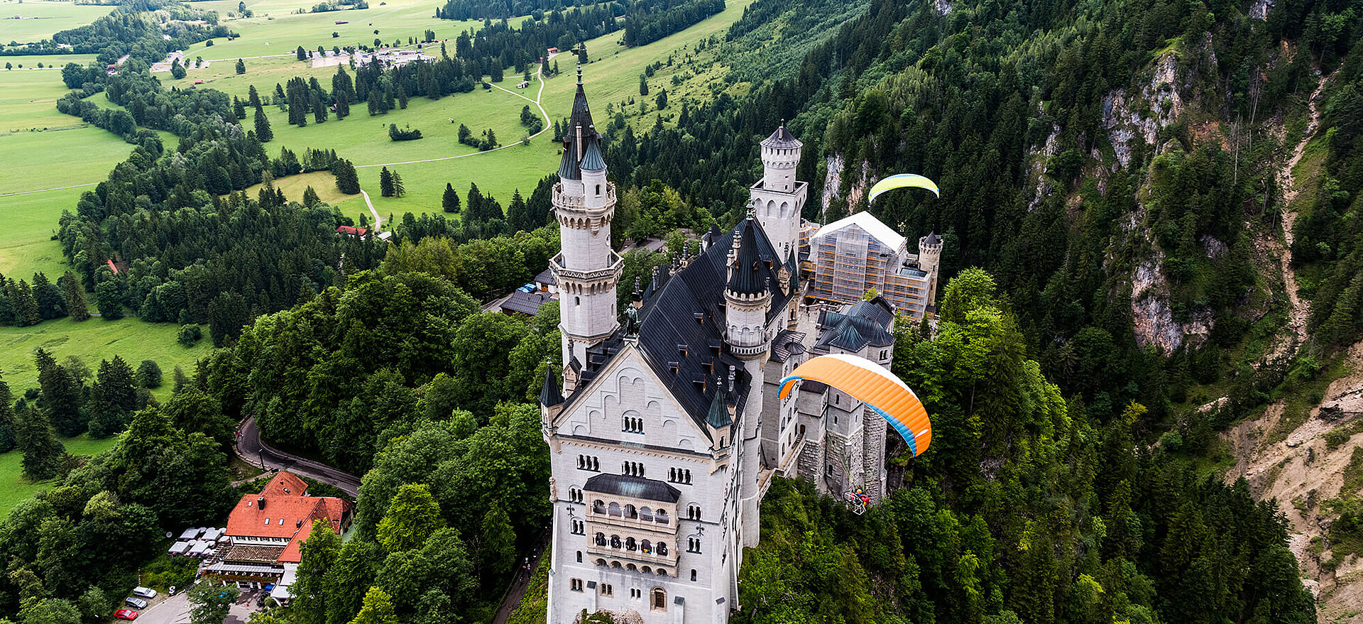 From Agathazell airfield in the Allgäu over the Tannheimer valley with the Haldensee into Lech valley. From Reutte over the Heiterwangersee as far as the Eibsee at the feet of the Zugspitze. Over the Plansee, past Schloss Neuschwanstein and over the Alp- and Forggen lakes back to Agathazell. (140 km, approx. 5 hr in the air)