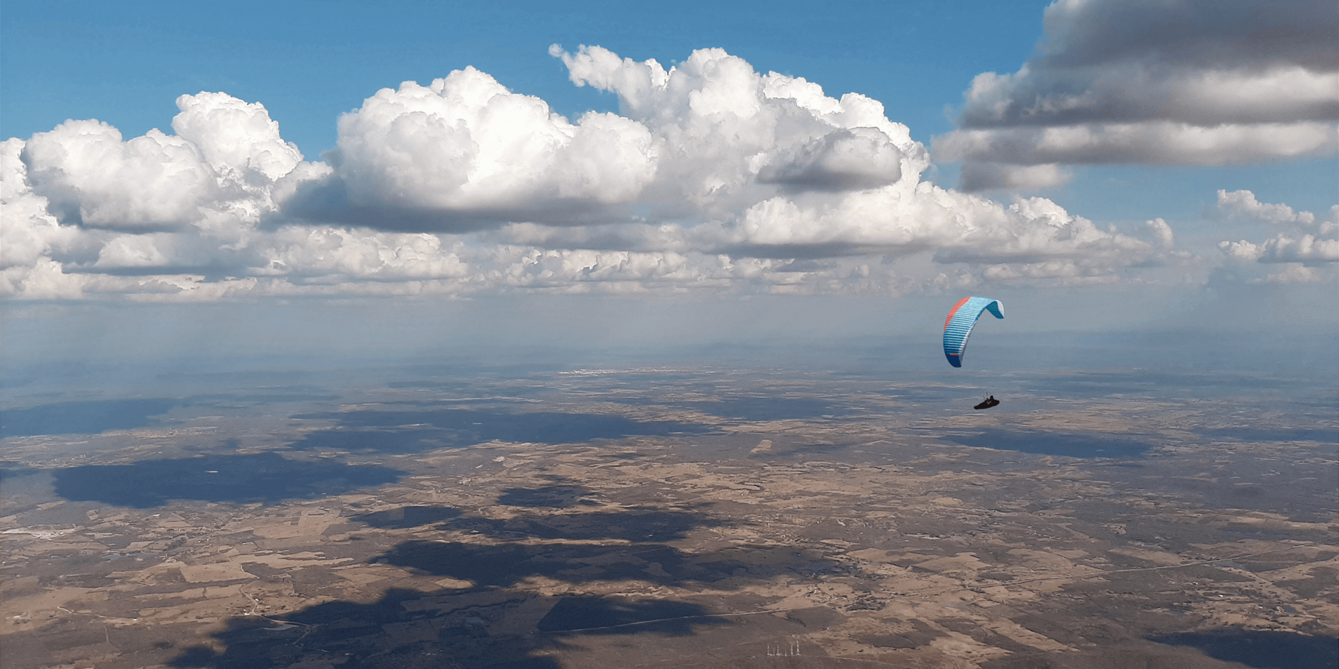 The first twenty minutes of the flight are challenging. For many XC pilots, this is where the greatest potential for frustration lies due to the low altitude achievable and narrow thermals. Verena keeps possible landing options in mind, but the direction of flight is clear, the wind blows from the southeast and carries her towards the northwest. Until the first proper crank up to 700 m, she manages her patience. The cloud base rises steadily. Verena reaches the 70 km distance mark, then three other pilots join her. Together they make their way from blue thermals to the next cloud street. Then comes the one thermal that separates her from the others. Verena enjoys this privileged view all to herself again. With soft music in her ear as the birds pass her by, her concern with time begins to disappear.