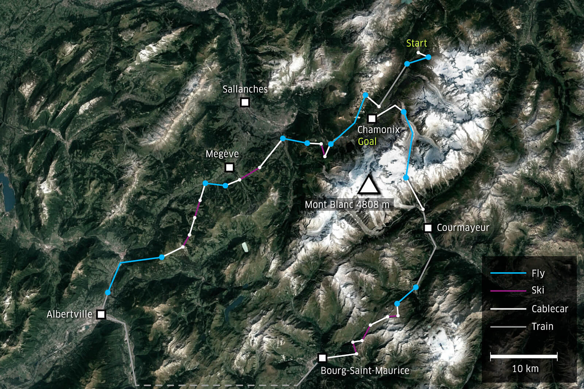 The Heilbronner cable car whooshes us up to 3,462 metres. It literally catapults us into the world of high mountains. The view from here is simply phenomenal. Conditions are also perfect. "We pull up our wings one last time at the Col des Flambeux and enter the immense glacier world. We glide over the Vallée Blanche to Chamonix, all the gigantic high mountains next to us: Dent du Géant, Grandes Jorasses, Aiguille Verte...simply overwhelming,” enthuses Fred.