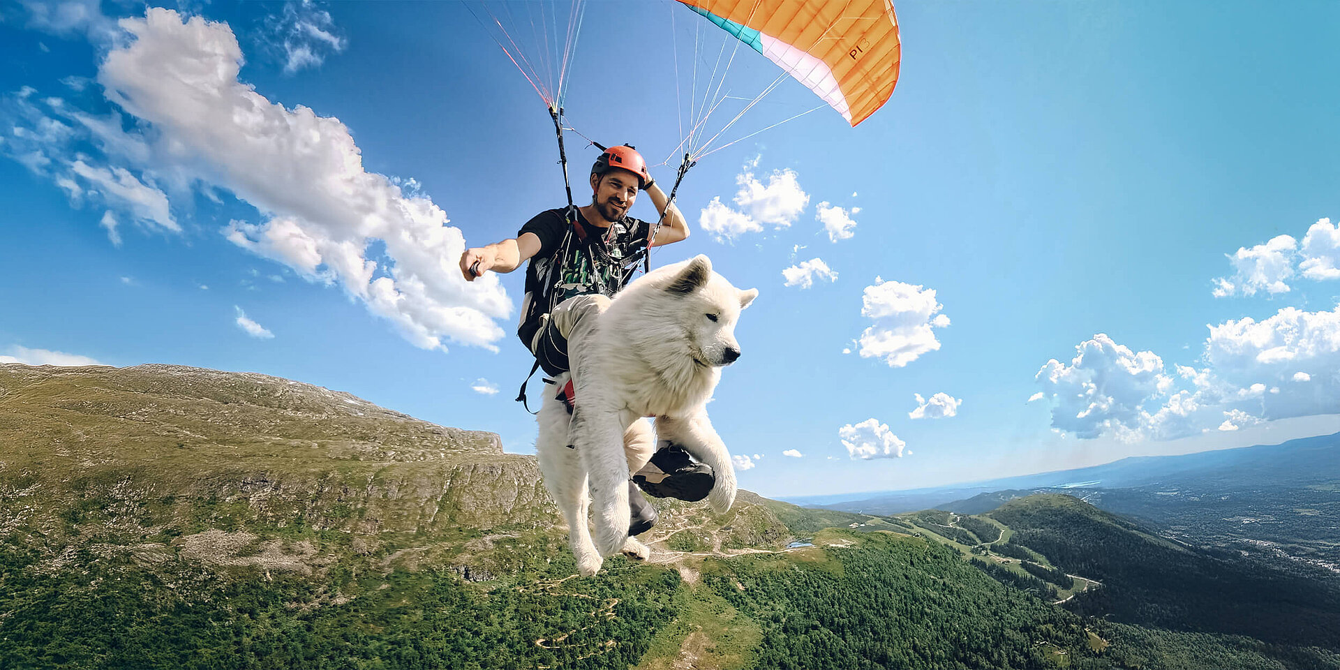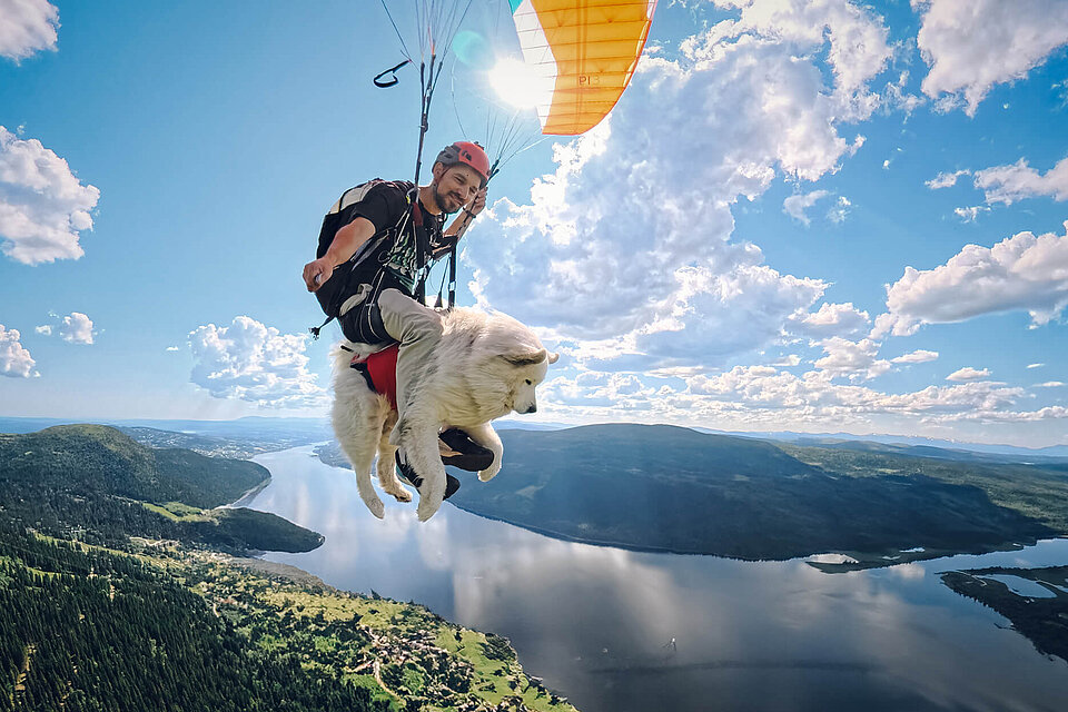 Anyone watching this unusual tandem at the takeoff is sure to be amazed. The two are perfectly in sync. Ouka positions himself between Shams' legs and waits intently. Then they run together, and soon they are soaring through the air. It took months of meticulous training to get everything running smoothly: building trust, getting used to noises, simulating takeoffs and much more. Today’s flight is pure pleasure. “Ouka enjoys the mountain panorama with its rivers and valleys. He loves observing everything around him — even when he’s on the ground,” Shams remarks later.