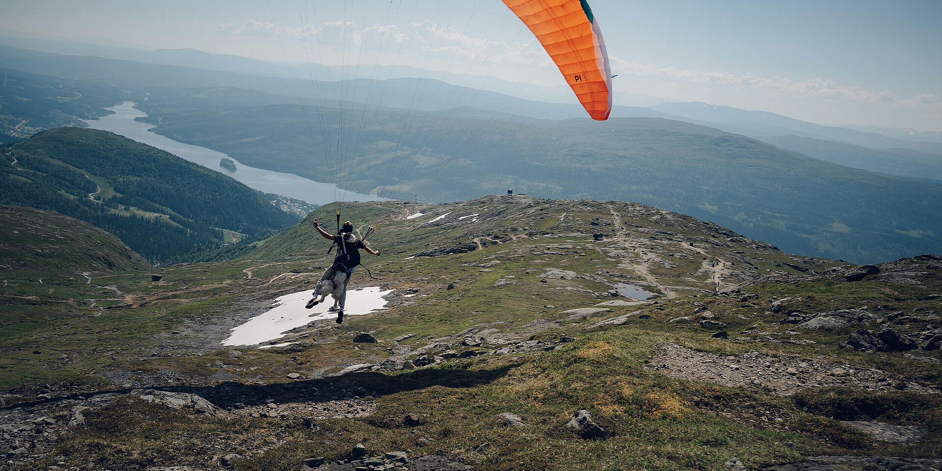 climbing a nearby mountain on foot, then flying back down with a paraglider. At the launch site Ouka greets the other pilots loudly then waits patiently while Shams lays out the glider. Finally, Ouka slips into his custom-made harness and off they go.