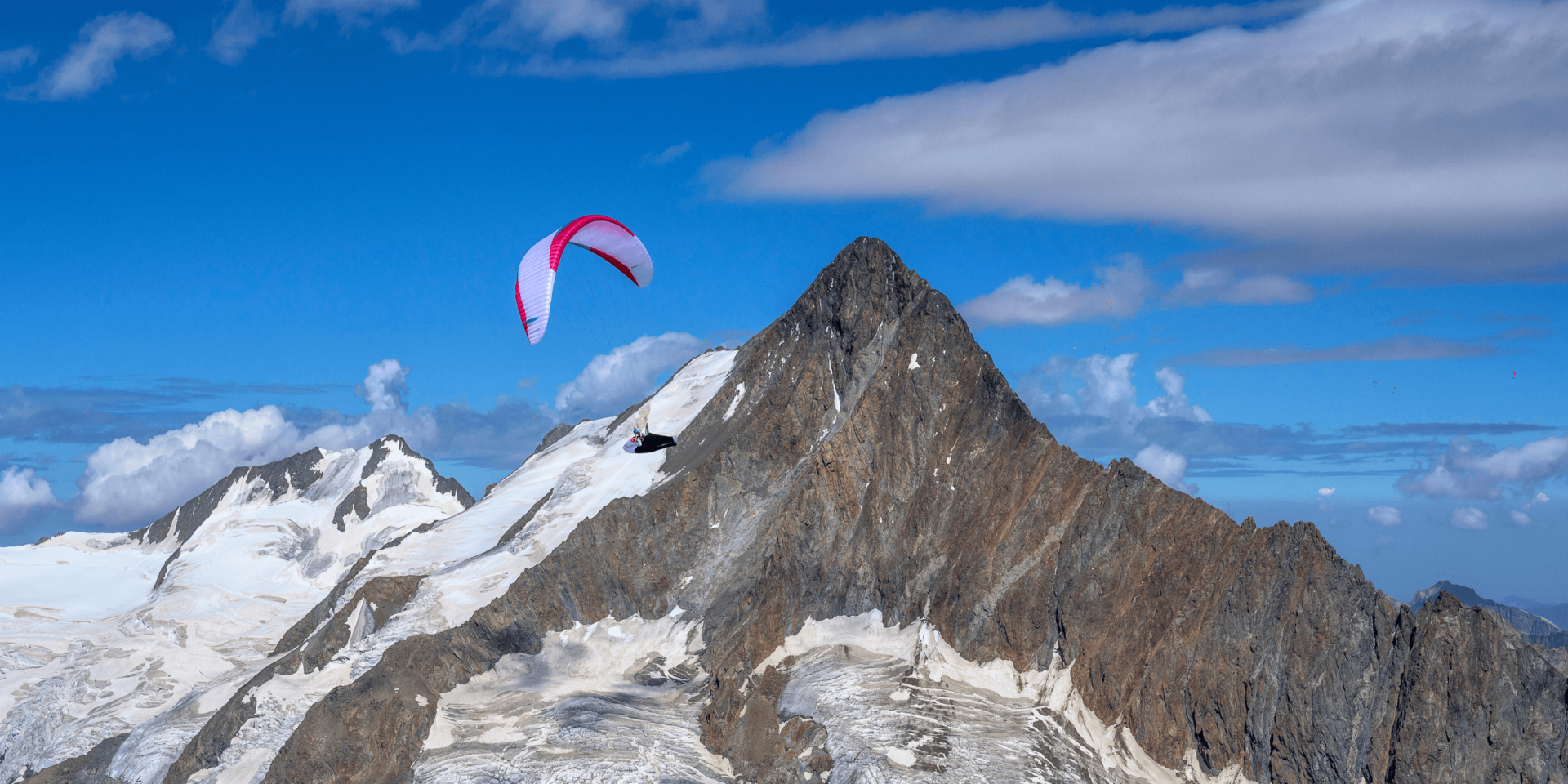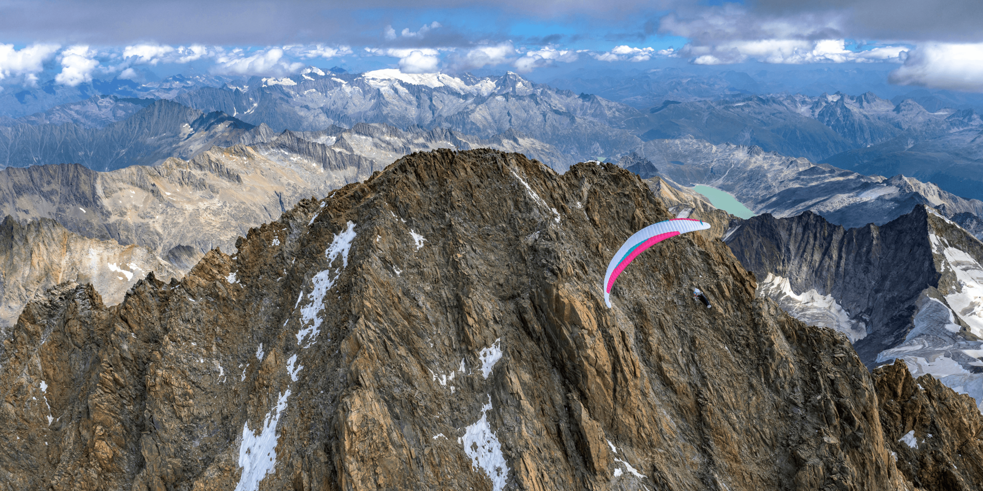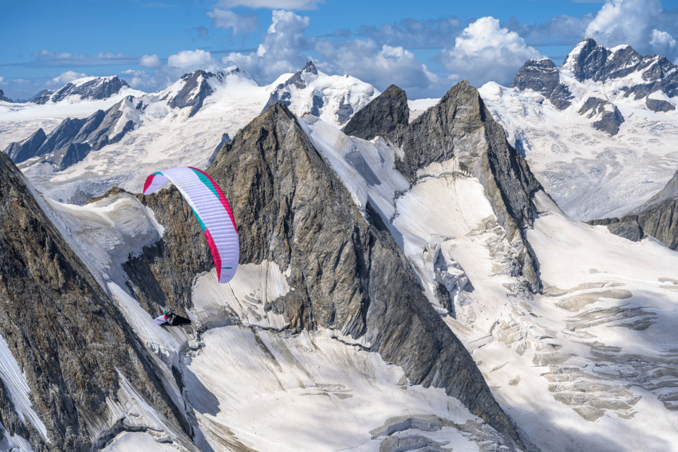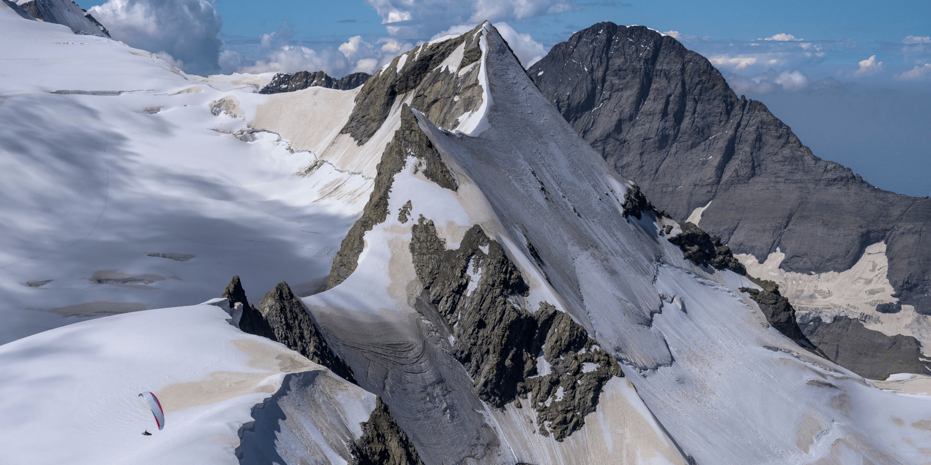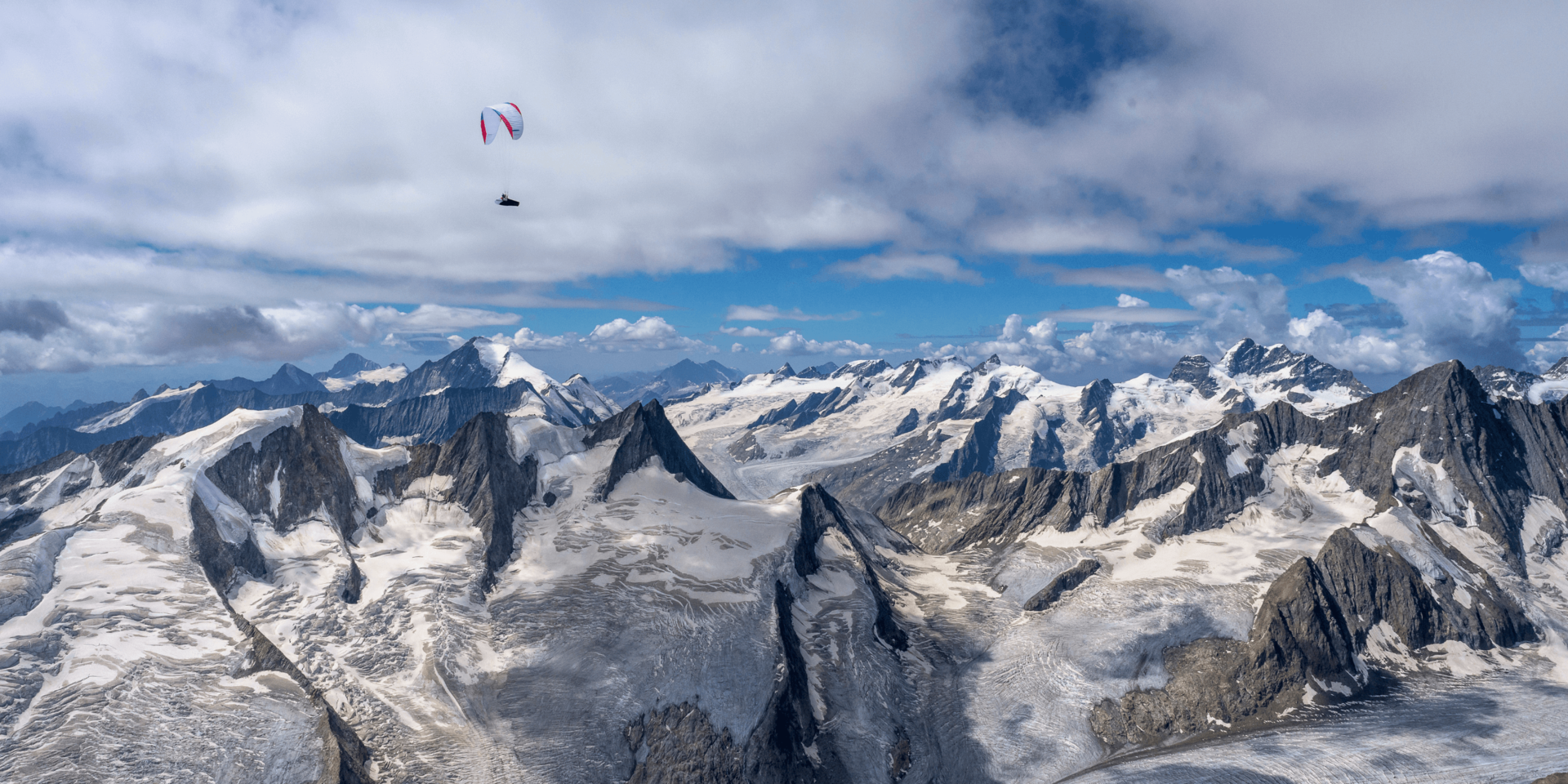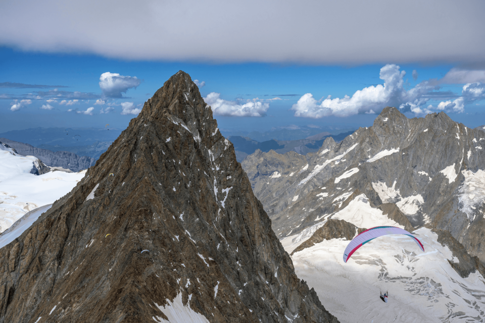 Crevasses profondes, éboulements, solitude, absence de réseau de téléphonie mobile. Pas un environnement dans lequel on voudrait se poser. Se préparer un plan B à l'avance et garder un œil sur le point de non-retour est ici une nécessité. Finalement, ça porte bien. Des cumulus comme dans un livre d'images. Ils portent si bien qu'Andy et Mimo volent la plupart du temps entre 3500 et 4000 mètres. Pendant près d'une heure, ils profitent du vol autour du sommet du Finsteraarhorn, jusqu'à ce qu'ils puissent le survoler au bout de plusieurs tentatives. Le moment dont Andy rêvait depuis si longtemps.