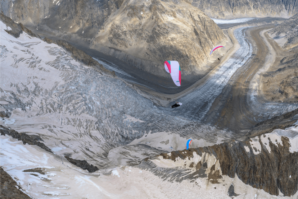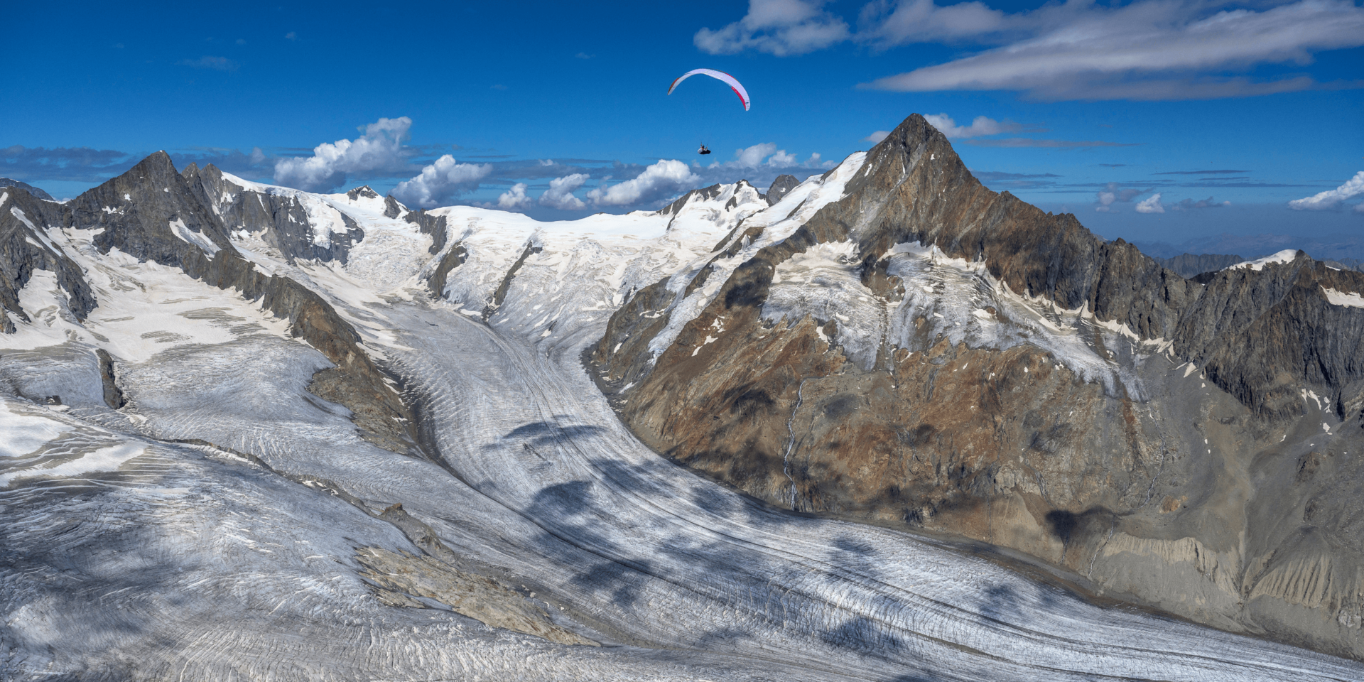 Ce pour quoi le Valais est moins connu, ce sont les thermiques faibles. Mais aujourd'hui, c'est le cas. La base des nuages ne monte que lentement, Andy et Mimo ne sont donc pas très pressés de partir. Sur le site de décollage, il n'y a plus beaucoup de pilotes qui s'apprêtent à décoller, à part eux. Pour prendre de l'altitude, ils doivent faire preuve de patience - pour un terrain alpin, l'air est étonnamment doux. De l'Eggishorn, ils passent finalement par le grand Wannenhorn jusqu'au Triftgrat, où ils traversent le glacier de Fiesch. Et soudain il est là, devant eux : le Finsteraarhorn.