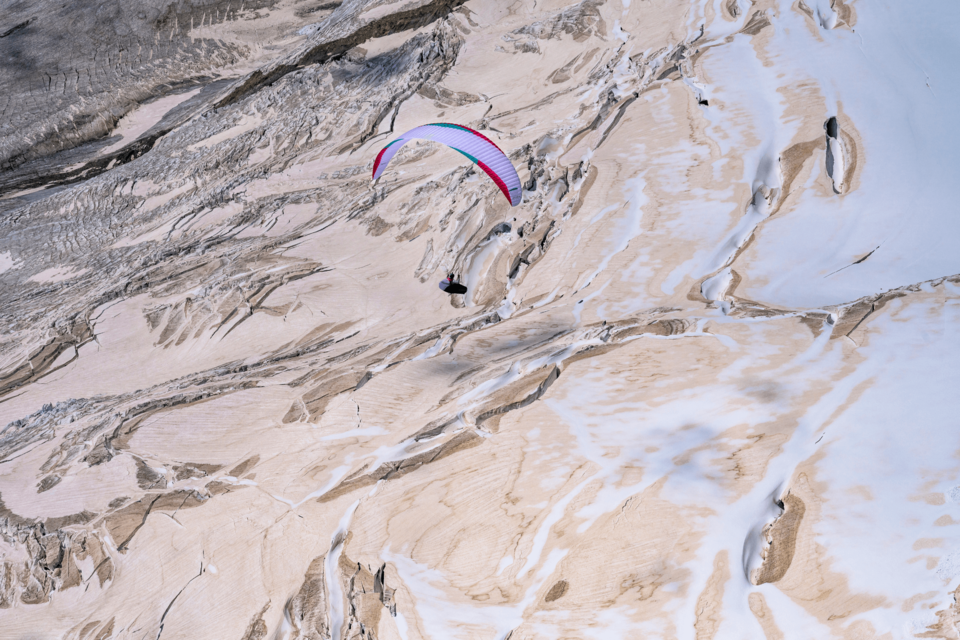 Le sommet qui domine tout. Celui que l'on admire depuis le col de la Furka, l'Oberland bernois et le Tessin et que tant de gens ont inscrit sur leur liste de choses à faire avant de mourir. Entouré des plus grands glaciers des Alpes, le Finsteraarhorn a un prix. Pour l'atteindre à pied, il faut se frayer un passage sur plusieurs jours. La météo ne permet que rarement d'y accéder par les airs. On a presque l'impression qu'il est quasiment impossible de s'y rendre en parapente. Le monde des glaciers inspire tout simplement le respect.