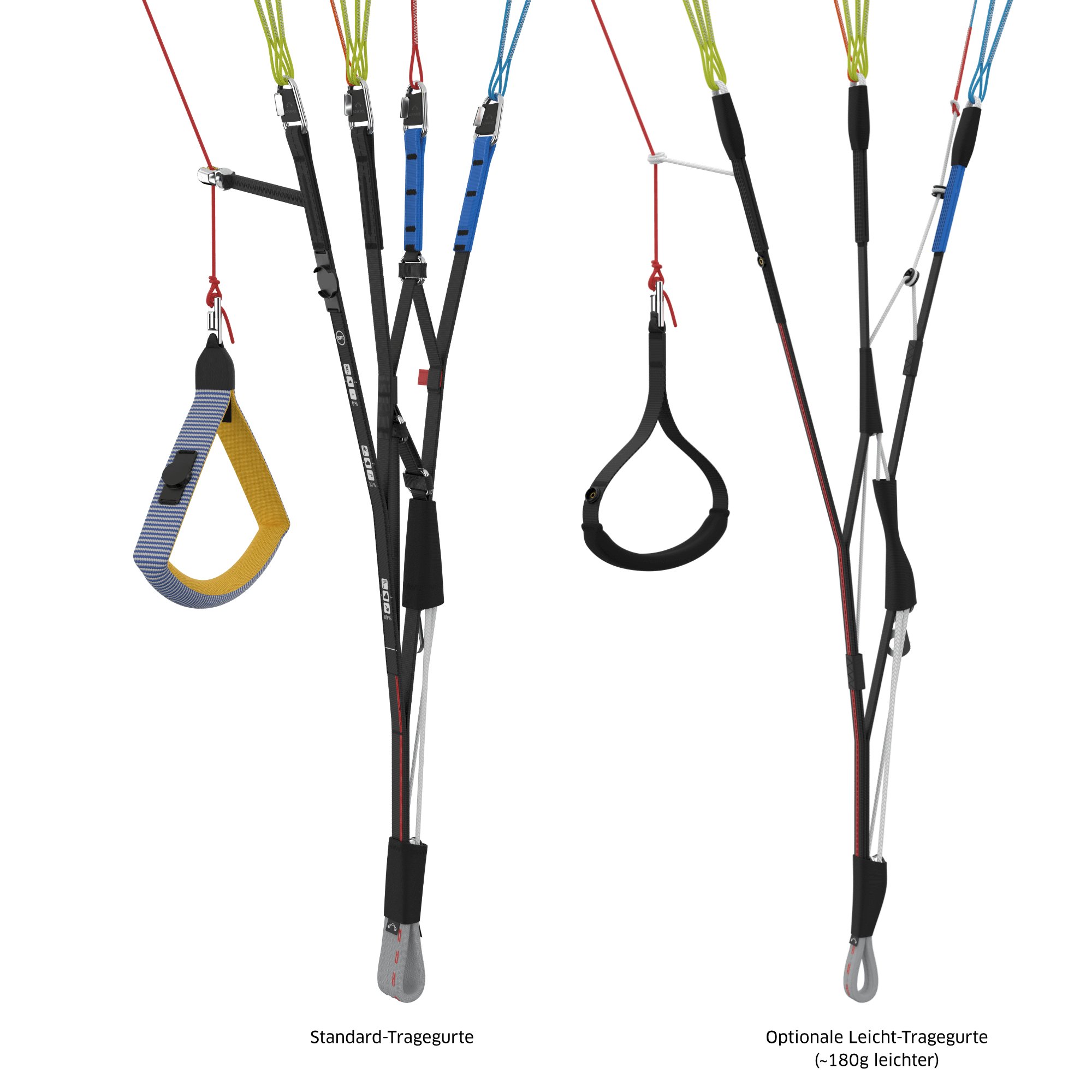 Der EPSILON DLS kann bei Bedarf mit optionalen Leicht-Tragegurten bestellt werden. Diese sind ~180 g leichter und unterscheiden sich neben der Materialwahl in folgenden Punkten vom Standard-Tragegurt: