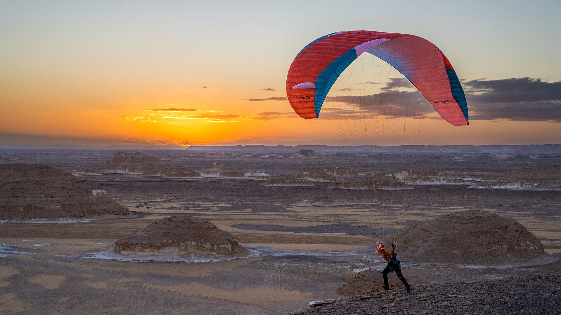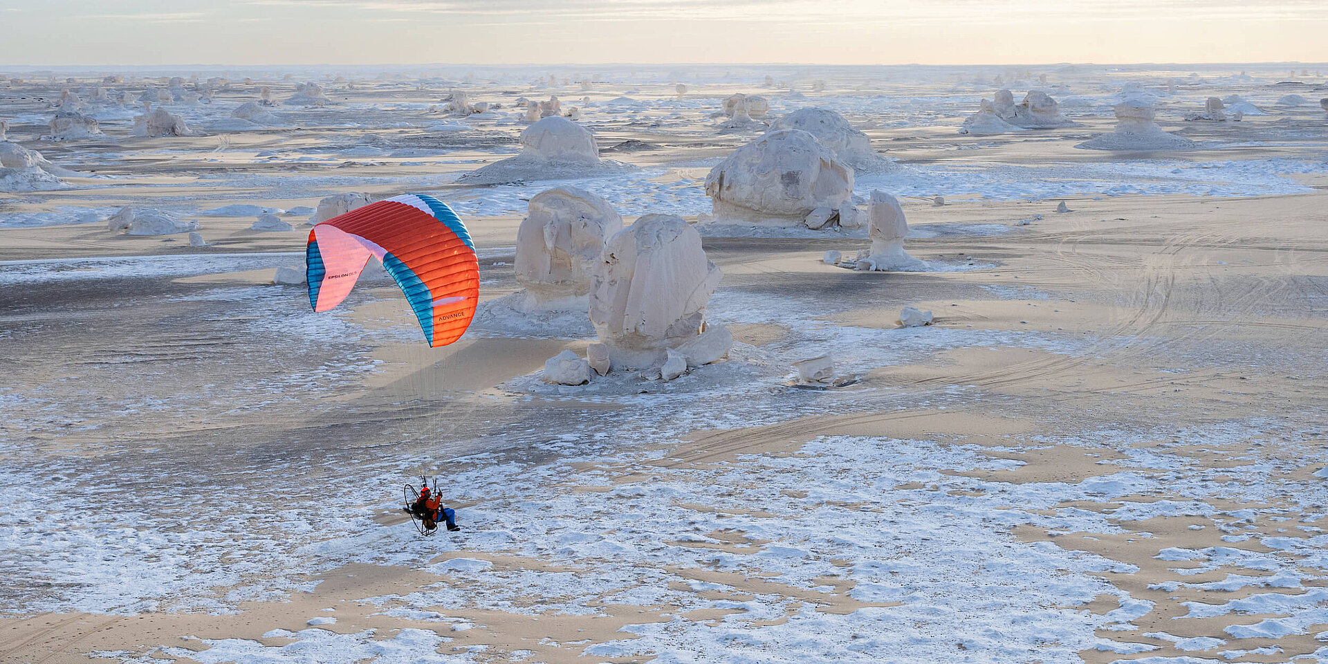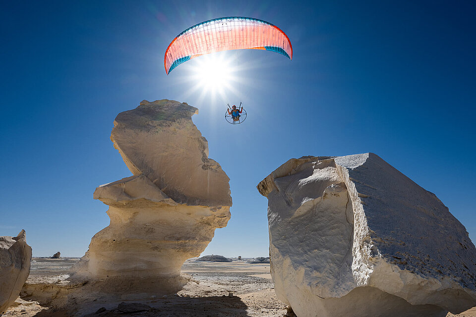 Die Eindrücke dieser spektakulären Erlebnisse wecken Adis und Martins Entdeckergeist. Beflügelt von ihrer Begeisterung beginnen sie noch am selben Abend neue Pläne zu schmieden: Eine Abenteuerreise durch die weiten Wüsten, fernab der Menschenmassen. Dafür kehren die beiden bereits einen Monat später zurück. Mit ihrem Guide und ihrem Land Rover tauchen sie mit jedem Kilometer weiter in die ohrenbetäubende Stille der Wüste ein und lassen die asphaltierten Strassen hinter sich. Sie erreichen die Monolithen der Weissen Wüste bei aufgehender Sonne. Mit ihren Paramotoren starten sie direkt zwischen den weissen Kalksteinformationen. Es ist als hätte es in der Wüste geschneit, so weiss strahlen die Gebilde. Die Vielfältigkeit der Natur Ägypten wird ihnen so richtig bewusst, als sie im Tiefflug durch die von Wind und Wetter geformte Wüstenlandschaft fliegen, die vor vielen Millionen Jahren noch Meeresgrund war.
