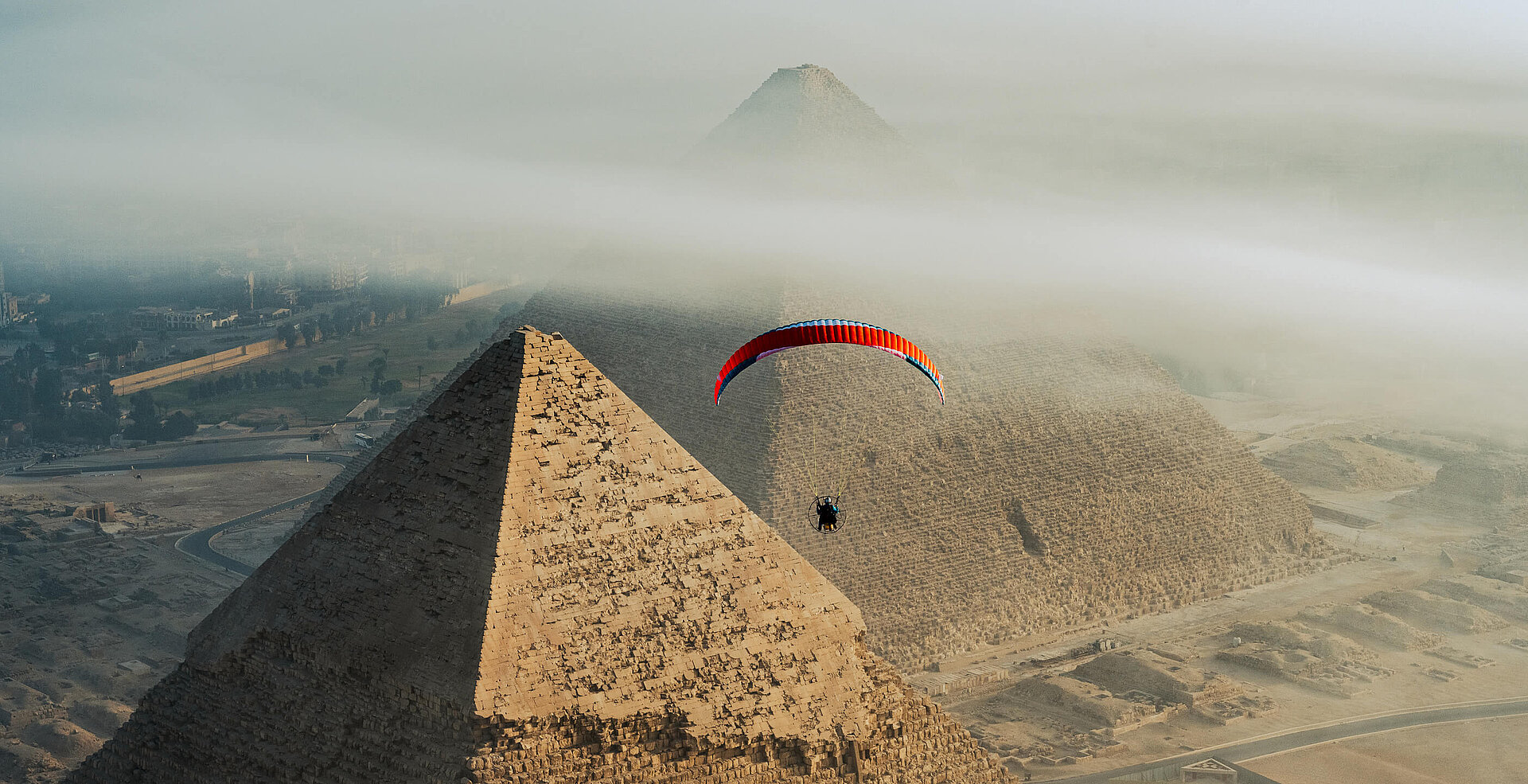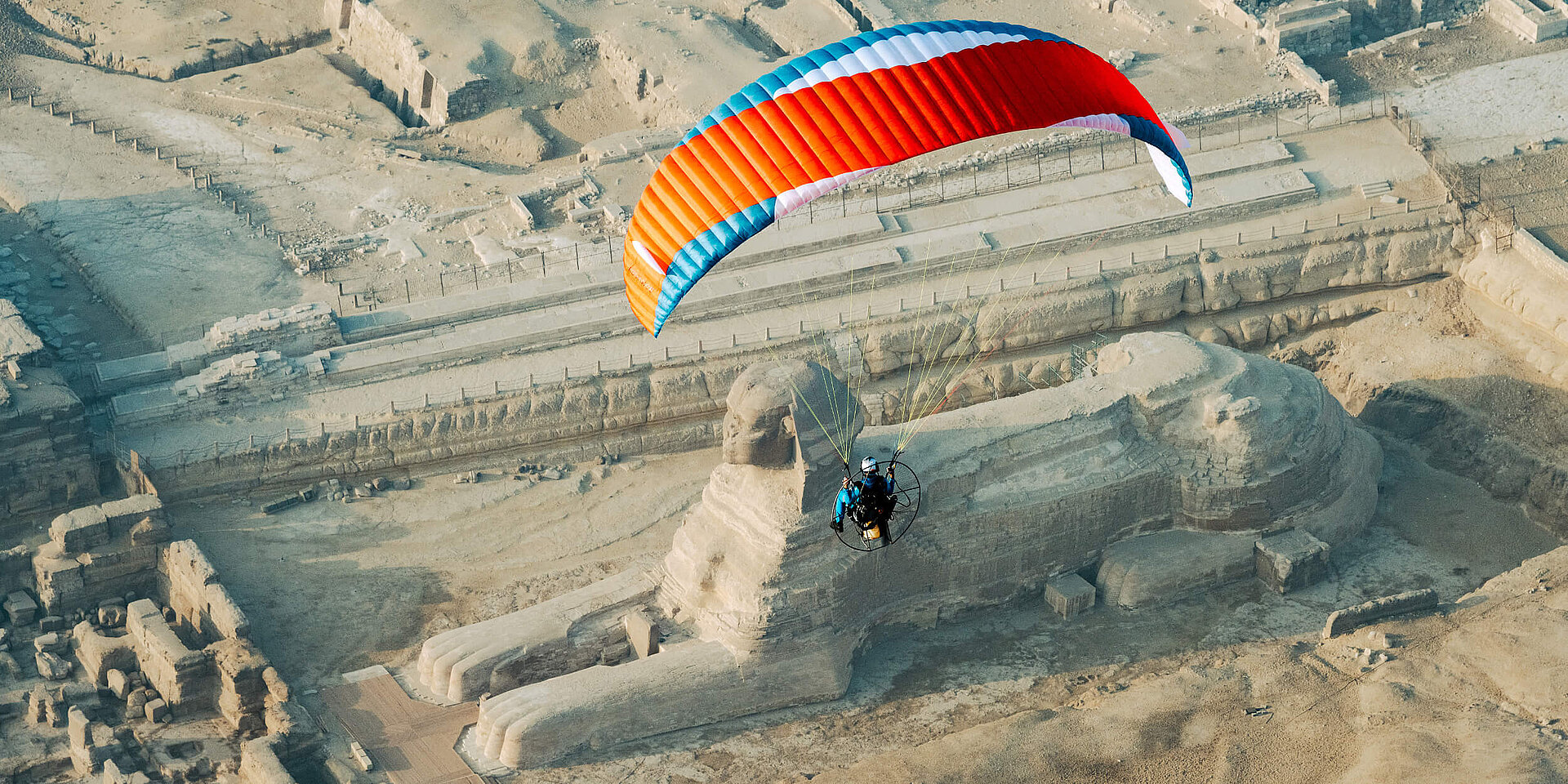 Die warme Wüstenluft und ein Orchester aus Autohupen und Gebetsrufen empfangen Adi und Martin als sie in Kairo landen. Zeit für die Erkundung der pulsierenden Millionenmetropole bleibt ihnen heute jedoch nicht. Auch wenn die Stadt niemals schläft, für die Piloten ist die Nacht um 3 Uhr vorbei. Das Adrenalin der Vorfreude auf den Flug um die monumentalen Bauwerke weckt die beiden effektiver auf als ein Mokka es je könnte. Die über 4500 Jahre alten Pyramiden erstrahlen in der sanften Morgensonne. Nach drei langen Wochen des Zitterns um Adis Flugerlaubnis kann er kaum glauben, dass Martin und er dieses antike Weltwunder gleich ganz für sich haben werden. Die zwei Piloten verlieren keine Zeit und machen sich fertig für ihren Start mit den motorisierten Gleitschirmen.