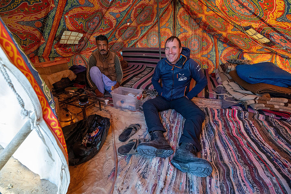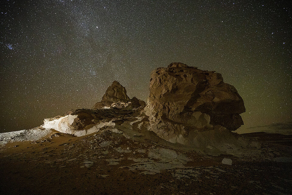 Am Abend sitzen Martin und Adi mit ihrem Guide Tamer am Lagerfeuer bei Minztee und Eintopf. Für ihre fünftägige Reise quer durch die Wüste haben sich die drei in der Bahariya Oase nur mit dem nötigsten eingedeckt, denn für den Luxus der grossen Hotelanlagen sind die beiden Piloten nicht erneut nach Ägypten gereist. Jede Nacht schlagen die Drei ihr einfaches Lager an einem anderen menschenleeren Ort auf, an dem allein die Natur ihre Spuren hinterlassen hat. In der völligen Abgeschiedenheit werden sie Zeugen eines Phänomens, dass die Region seit zehn Jahren nicht mehr erlebt hat: Regen. Adi und Tamer lachen ungläubig, als Martin sich wundert, ob es gerade wirklich ein Regentropfen war, den er abbekommen hat. Eine halbe Stunde später stehen sie komplett durchnässt mitten in der stockdunklen Wüste unter dem klarsten Sternenhimmel, den Adi je gesehen hat. Der seltene Regen hat jeglichen Staub aus der Luft gewaschen.