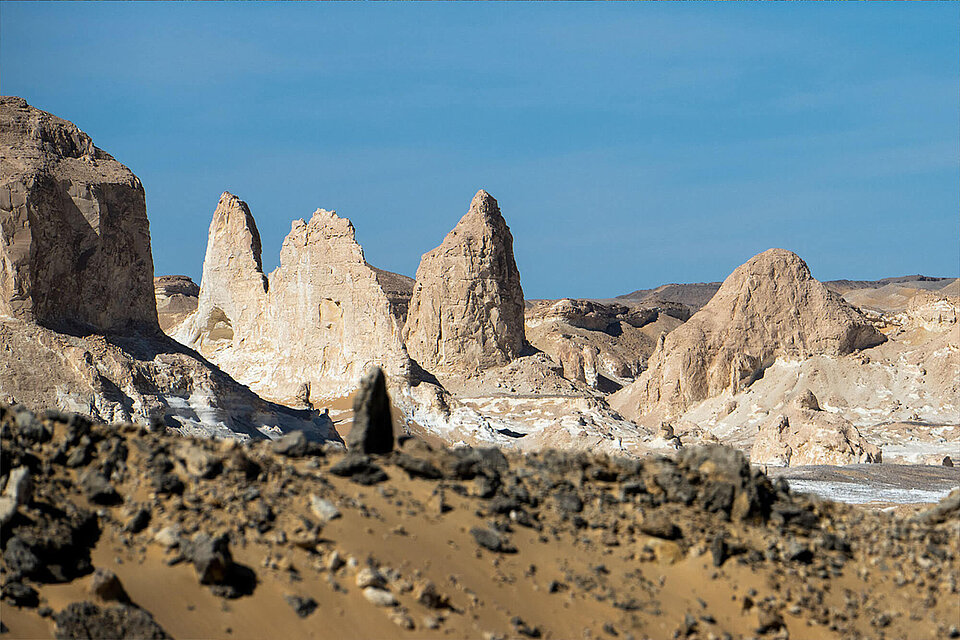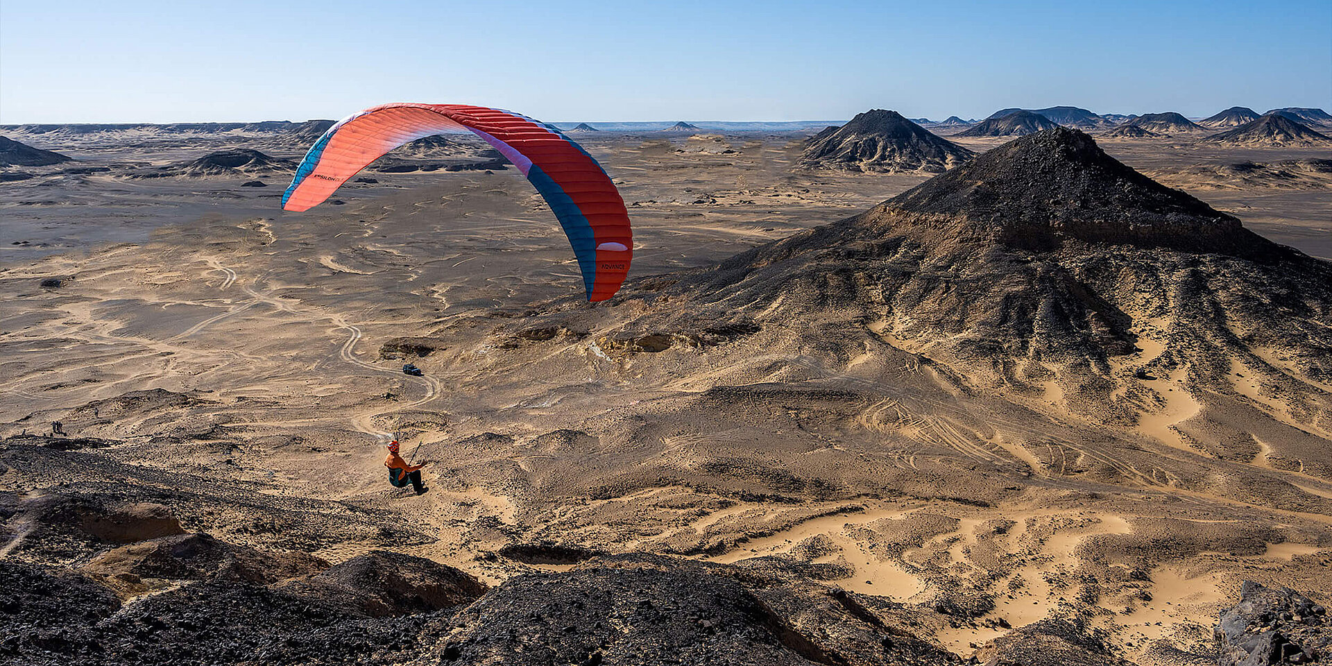 Die Kontraste Ägyptens enttäuschen nicht. Es kann laut sein. Und totenstill. Über 100 km nördlich der Weissen Wüste hat sich nach tausenden Jahren vulkanischer Aktivität die Schwarze Wüste gebildet, deren schwarze Lavaüberreste ihr ihren Namen verleihen. Ein anspruchsvoller Ort zum Fliegen und besonders zum Starten. Das scharfkantige Lavagestein im steilen Gelände ist prädestiniert, um die dünnen Leinen beim Start zu verhaken und zerreissen. Hinfallen möchte hier niemand. Hier kommt den beiden Piloten ihre langjährige alpine Erfahrung zugute und so fügen sie sich lautlos in die Ruhe der Schwarzen Wüste ein, die sie viel mehr an die Oberfläche des Mars erinnert.